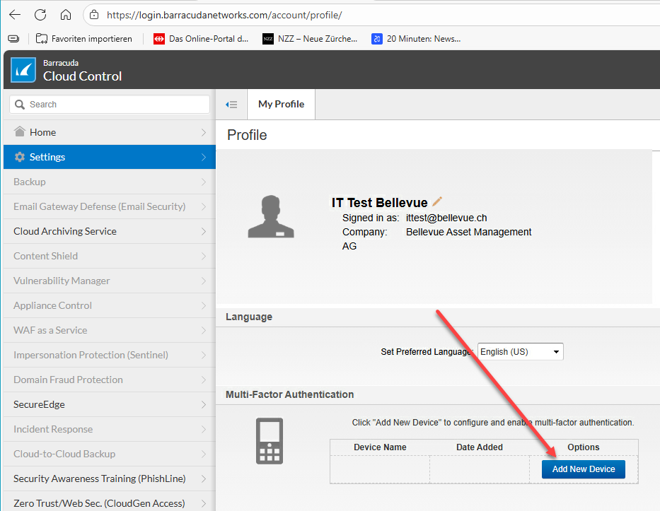 - Within the Barracuda Portal, go to "Settings" and then "Add New Device":
